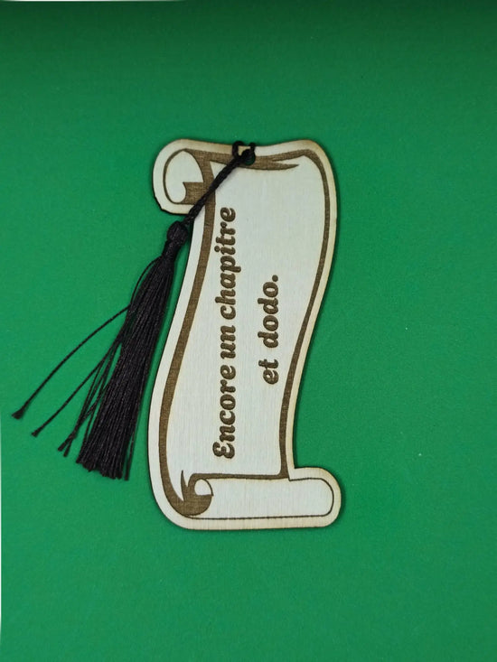 Marque pages en bois + son pompon, forme parchemin de 12cmx5,5cm. Personnalisable.